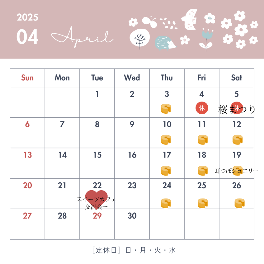 19日は耳つジュエリー。その他イベントが追加になりましたらお知らせさせていただきます。4月も宜しくお願いいたします。「名張市、スイーツ、シフォンケーキ、テイクアウト、グルテンフリー」