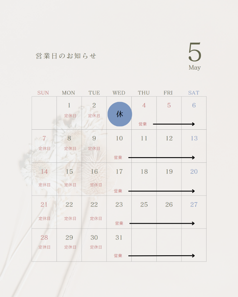 連休は定休日の4/30(日曜日)・5/1(月曜日)・5/2(火曜日)の定休日に加えまして